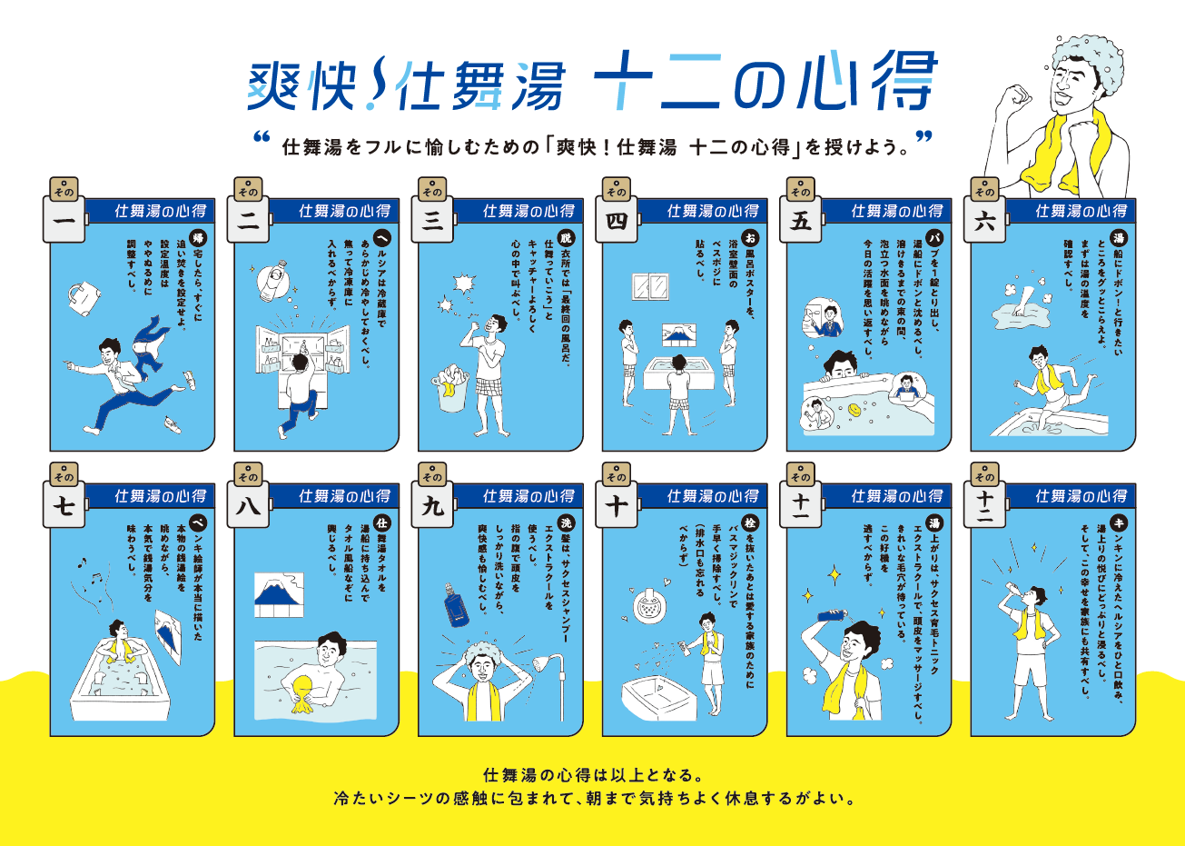1日の最初に入るお風呂を「一番風呂」というのに対して、最後に入るお風呂を「仕舞湯」と言います。花王サクセスは、仕舞湯を楽しむための花王商品などを詰め合わせにした仕舞湯セットをプレゼントする「爽快!仕舞湯キャンペーン」を本日より実施。このキャンペーンのクリエイティブディレクションおよびコピーライティングを担当させていただきました。仕舞湯を楽しむための「仕舞湯十二の心得」は必見!